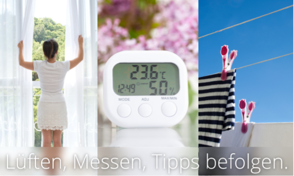 - Regelmäßiges Stoßlüften oder eine kontinuierliche mechanische Lüftung ist und bleibt eine unabdingbare Möglichkeit, Feuchtigkeit aus der Luft abzuführen. Lüften Sie 4-5x täglich für etwa 10-20 Minuten oder kontinuierlich mit einer Lüftungsanlage zur kontrollierten Wohnraumlüftung.